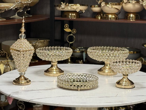 💎 سرویس پذیرایی مدل نگینکوب توربافت سرویس کامل با طراحی توربافت و نگینکاری براق. ✅ رنگ طلایی و سیلور ✅ جلوه خاص روی میز پذیرایی ✅ مناسب مجالس و ویترین دکوراتیو