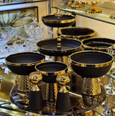 *5 تکه شامل :1عدد میوه خوری، 1عدد شیرینی خوری ،1عدد آجیل خوری دربدار ،1عدد شکلات خوری، یه جفت شمعدان