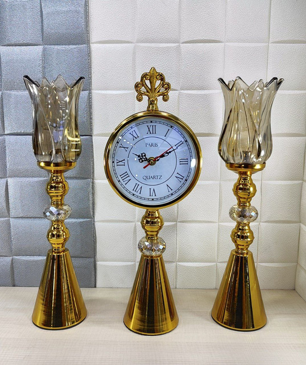 ست ساعت و شمعدان پایه دار رومیزی رنگ طلایی کد4068