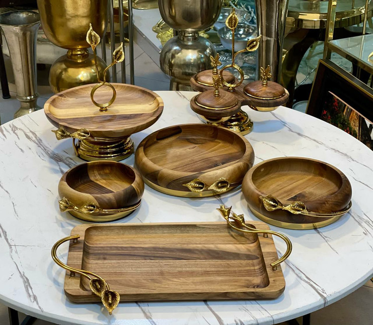 سرویس پذیرایی 6 تیکه چوبی فلزی رنگ طلایی گل شیپوری کد980055