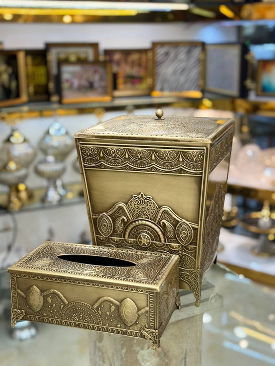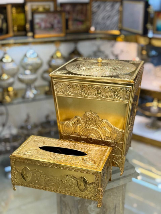 ست سطل و دستمال کاغذی فلزی مدل خاتم رنگ سیلور، طلایی، برنزی کد1641