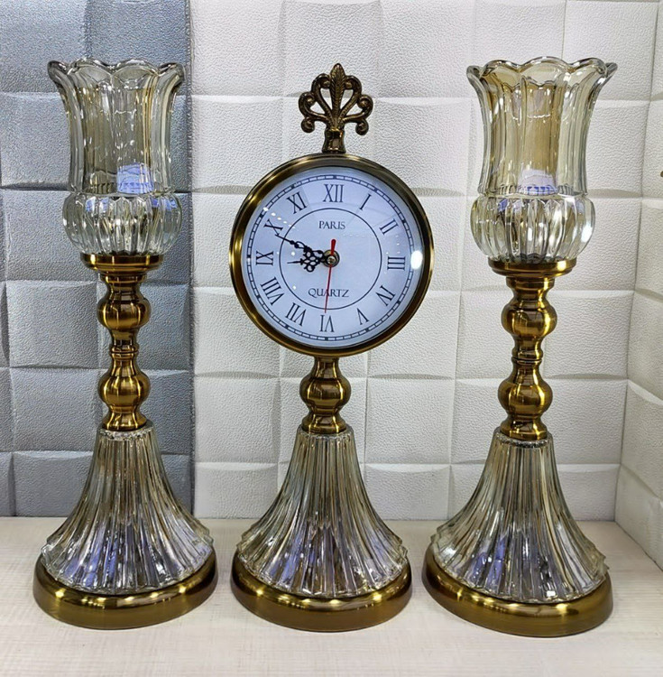 ست ساعت و شمعدان پایه دار رومیزی رنگ آنتیک کد9030