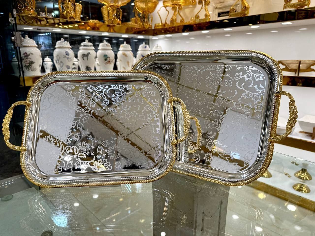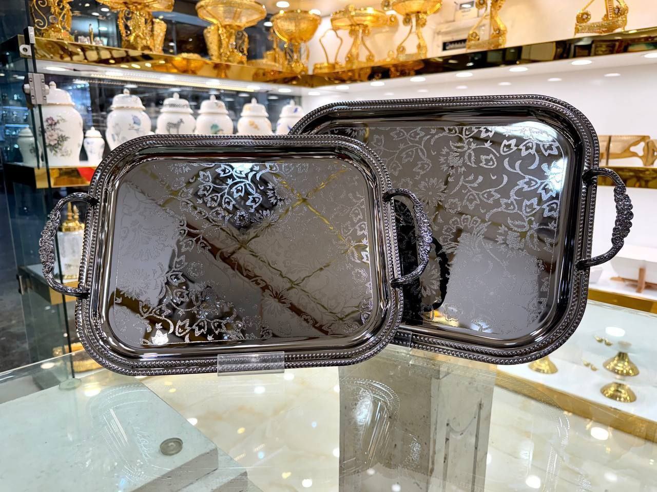 ست سینی پذیرایی استیل وارداتی طلایی _سیلور_دودی کد۲۱۱۶