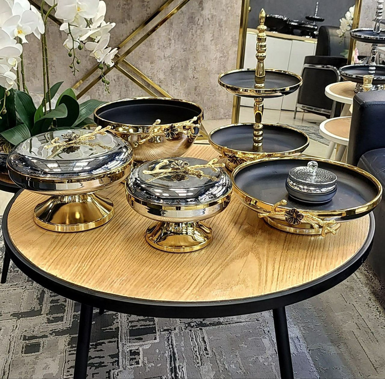 *5 تکه شامل :1عدد میوه خوری، 1عدد شیرینی خوری ،1عدد آجیل خوری دربدار ،1عدد شکلات خوری دربدار ،1 عدد مزه خوری دو طبقه