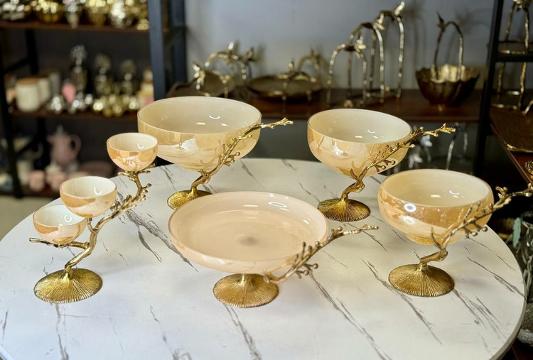 سرویس پذیرایی 5 تیکه بلور آلمینیومی طرح شاخه طلایی کرم