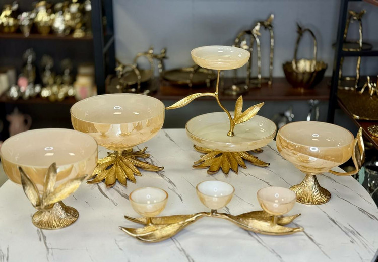 سرویس پذیرایی 5 تیکه بلور آلمینیومی طرح گلبرگ طلایی کرم