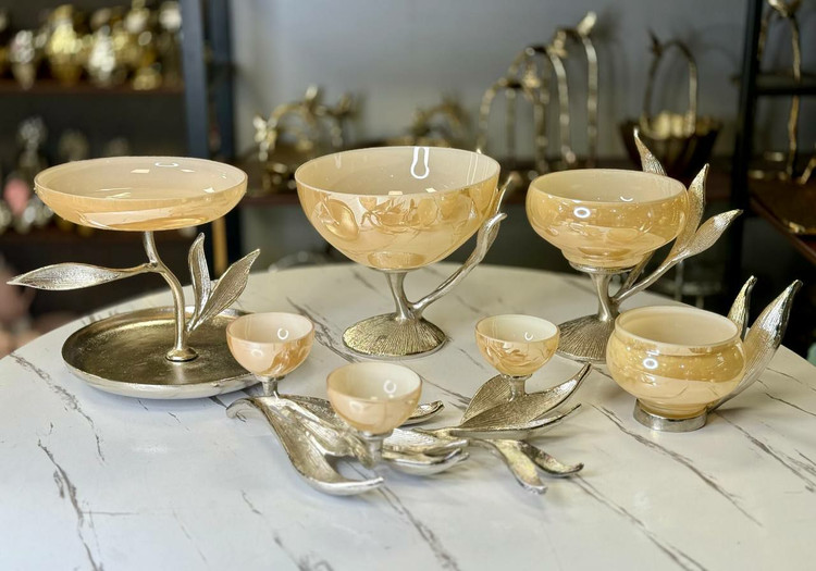 سرویس پذیرایی 5 تیکه بلور آلمینیومی طرح گلبرگ سیلور کرم