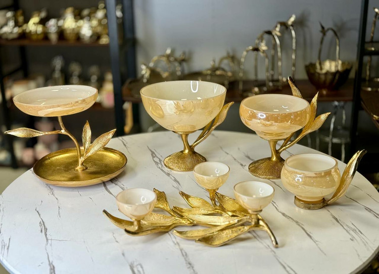سرویس پذیرایی 5 تیکه بلور آلمینیومی طرح گلبرگ طلایی کرم