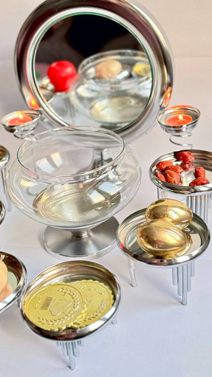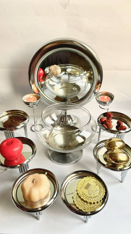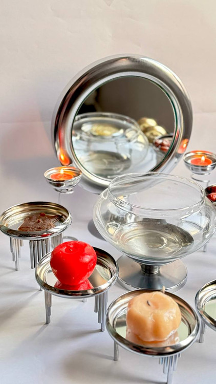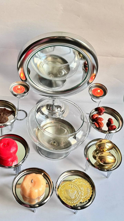 ست شامل :6عدد پیاله دو عدد شمعدان و 1 عدد آينه، 1 عدد تنگ ماهی