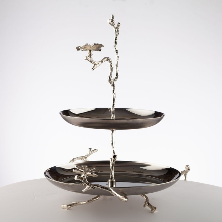 شیرینی _مزه خوری دو طبقه استیل برنج مدل پروانه سیلور طلایی، سیلور کدJ105