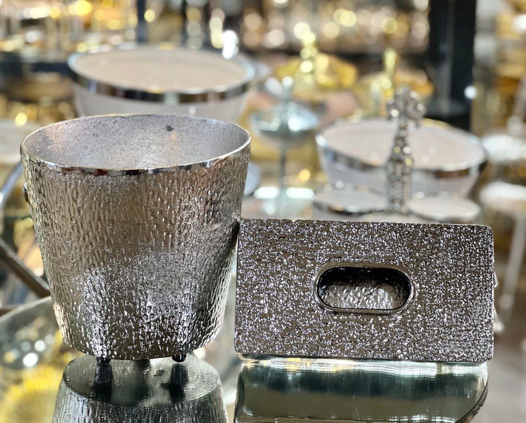 ست سطل زباله و جادستمال کاغذی رومیزی پذیرایی مدل چکش کاری شده آلمینیومی طلایی و سیلور کد۲۹۹۴