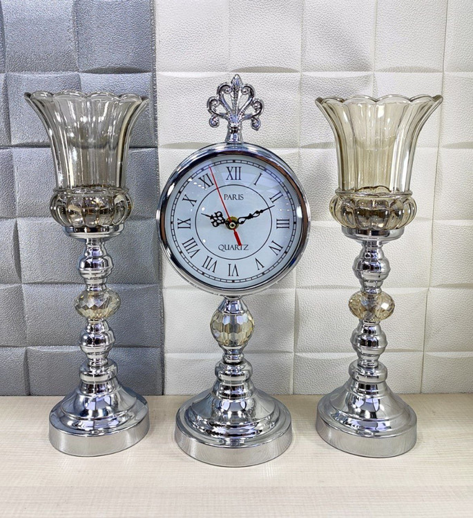 ست ساعت و شمعدان پایه دار رومیزی رنگ سیلور کد9015