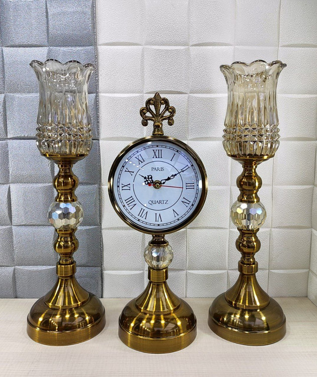 ست ساعت و شمعدان پایه دار رومیزی رنگ آنتیک کد7008
