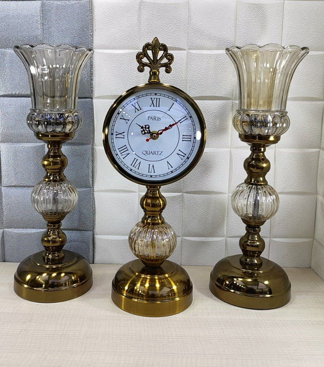 ست ساعت و شمعدان پایه دار رومیزی رنگ آنتیک کد9008
