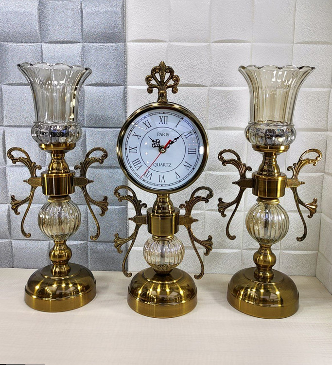 ست ساعت و شمعدان پایه دار رومیزی رنگ آنتیک کد9011
