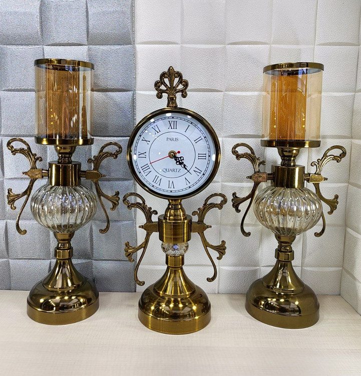 ست ساعت و شمعدان پایه دار رومیزی رنگ آنتیک کد9001