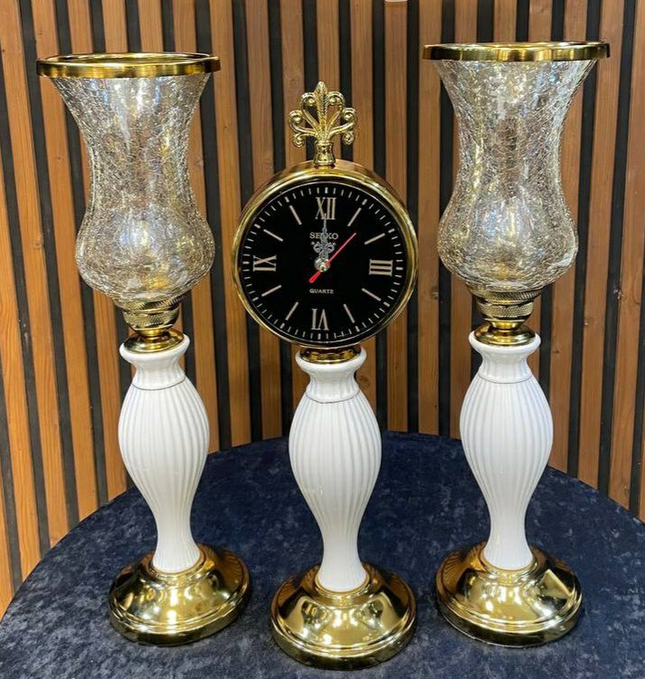 ست ساعت و شمعدان پایه دار رومیزی رنگ طلایی سفید کد1440