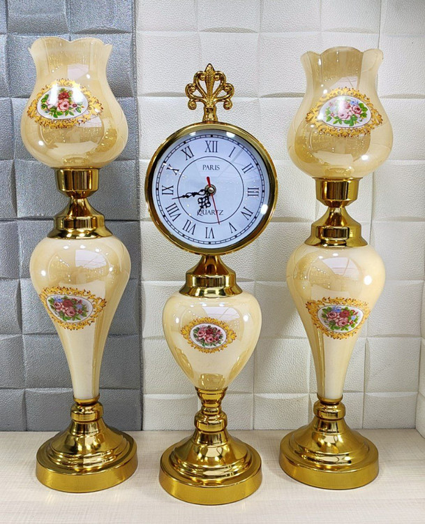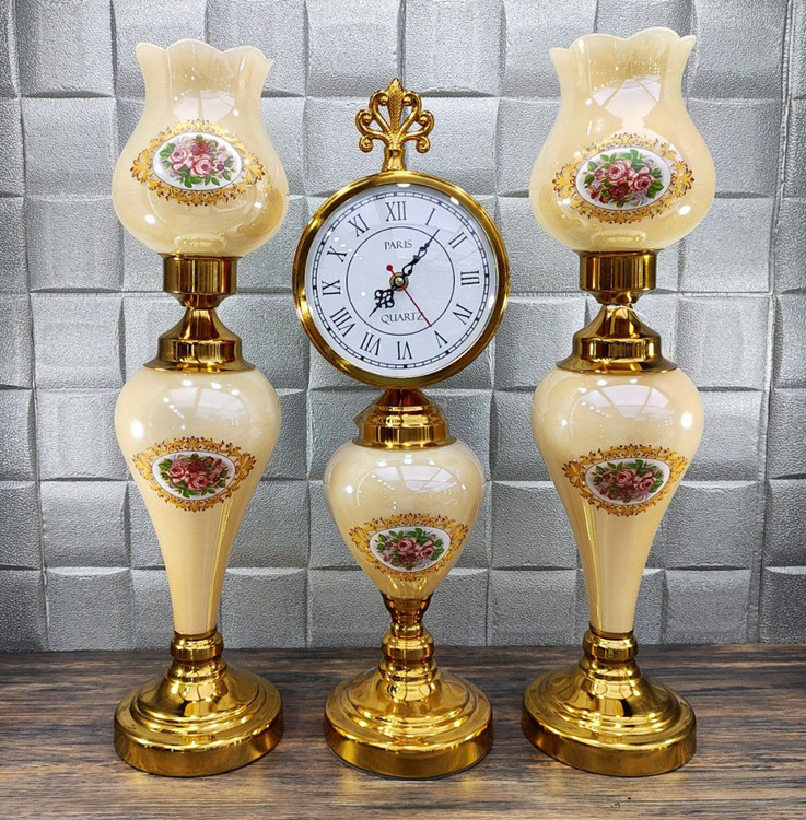 ست ساعت و شمعدان پایه دار رومیزی رنگ طلایی مدل گلدار کد9019